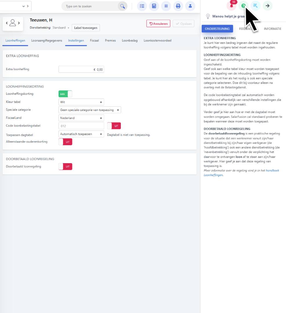 Wissel je van scherm (bijvoorbeeld van Verloningsinstellingen naar Periodegegevens), dan ververst de hulp automatisch mee.