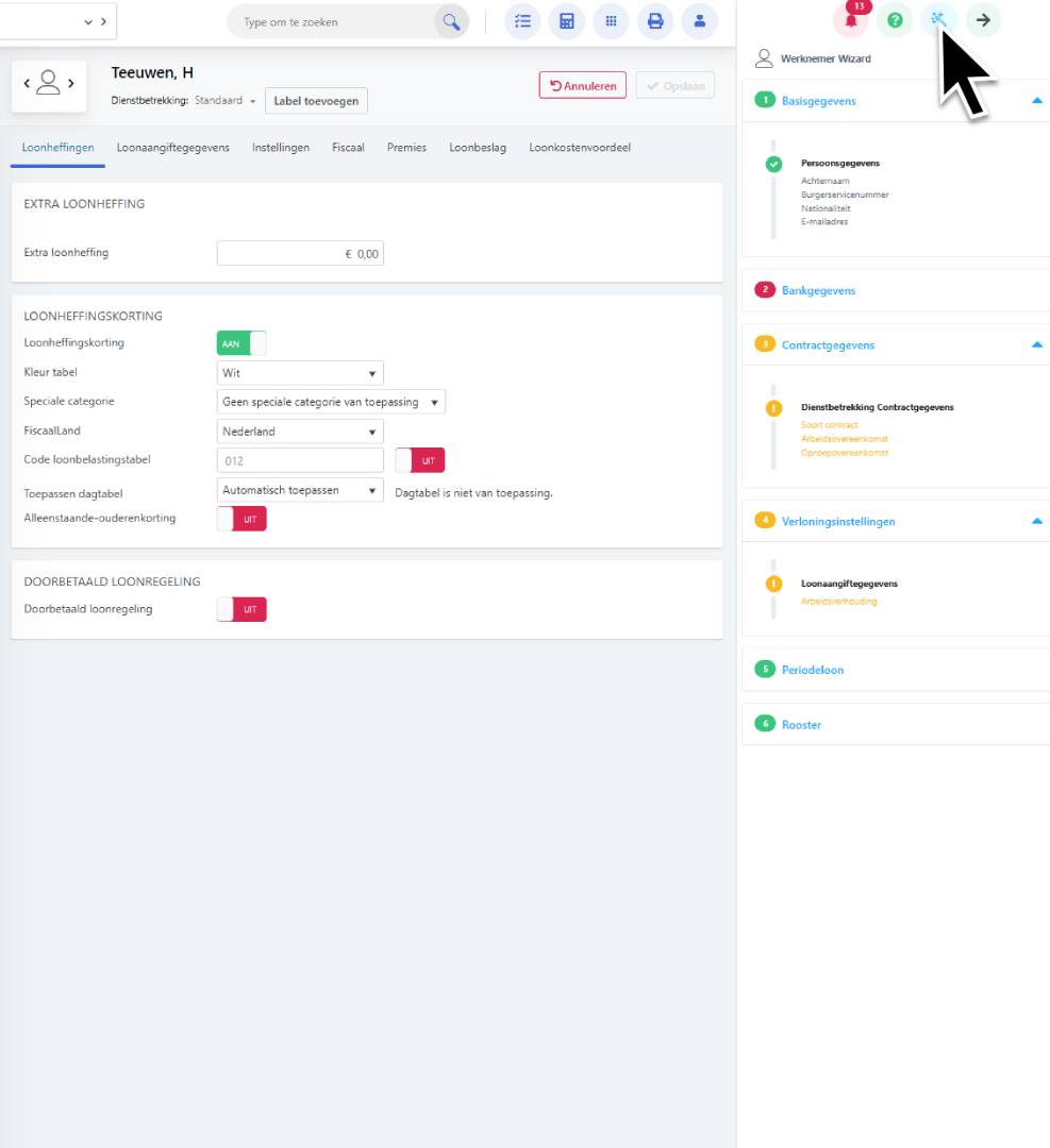 Wanneer je een nieuwe werknemer toevoegt verschijnt aan de rechterkant nu de werknemerwizard met blokken in rood of oranje.