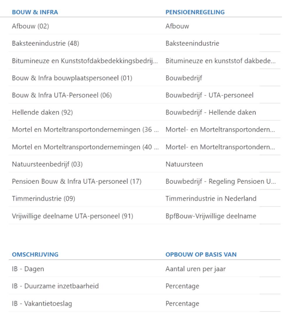 - Alle cao’s, waaronder Afbouw, Baksteenindustrie, Bitumineuze en kunststofdakbedekking, Bouwplaats- en UTA-personeel, Hellende daken, Mortelindustrie, Natuursteen en Timmerindustrie.