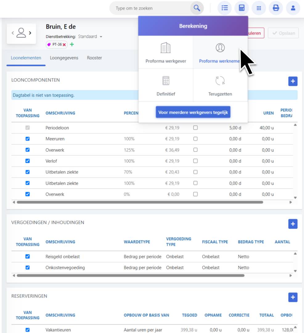 Nu kun je in Periodegegevens de mutatie aanpassen (bijvoorbeeld bonus wijzigen naar € 350) en opnieuw via het rekenmachine-icoon een proforma en definitieve berekening doen, bijvoorbeeld met Proforma werknemer.